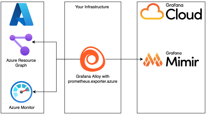 Complete the following steps to configure Azure Metrics with Grafana Alloy. This Alloy setup uses Azure Resource Graph to identify resources for metric collection. After identifying resources, Grafana Alloy, embedded with the azure-metrics-exporter, uses the Azure Monitor APIs to gather metric data. After the metric data is gathered, that data is written to Grafana Cloud Metrics.