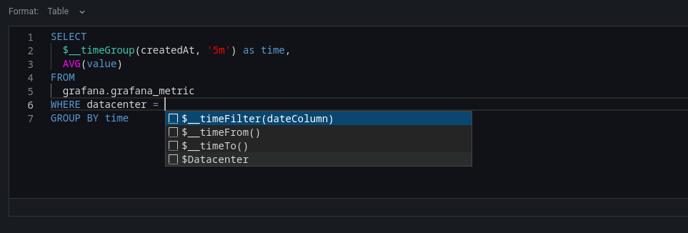 To create advanced queries, switch to Code mode by clicking Code in the upper right of the editor window. Code mode supports the auto-completion of tables, columns, SQL keywords, standard SQL functions, Grafana template variables, and Grafana macros. Columns cannot be completed before a table has been specified.