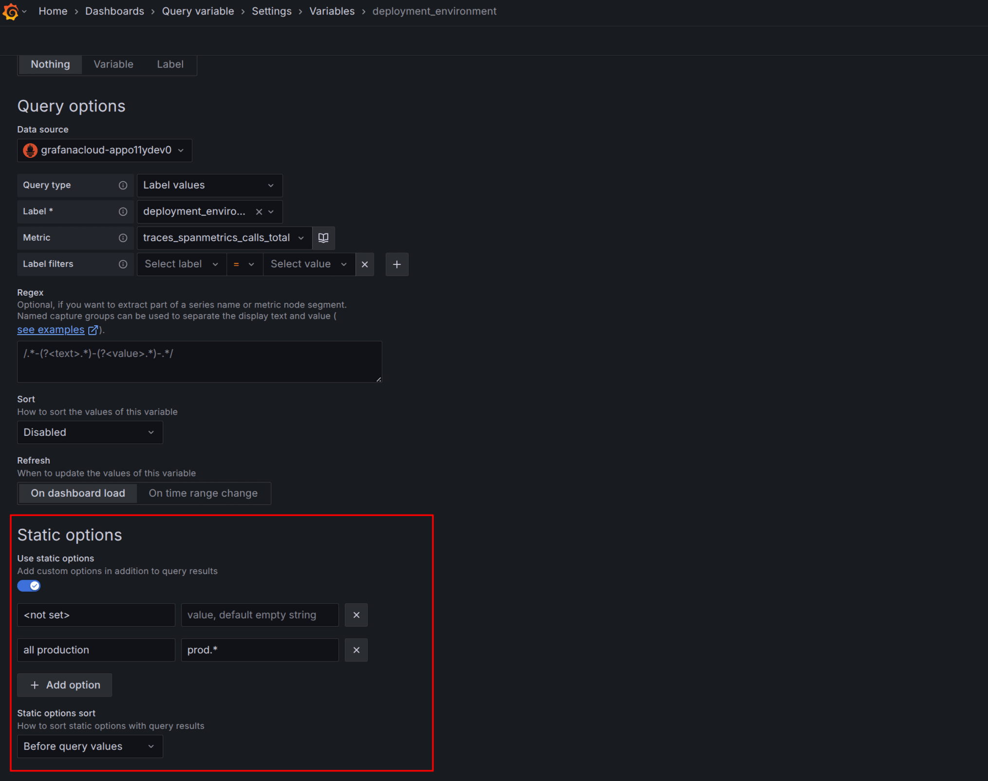 You can now define additional static options for query variables to be included with the options retrieved by querying the data source. This affords you more flexibility, allowing you to create options like “value not set” or “all clusters in Asia”.