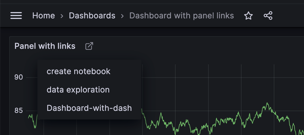 Each panel can have its own set of links that are shown in the upper left of the panel after the panel title. You can link to any available URL, including dashboards, panels, or external sites. You can even control the time range to ensure the user is zoomed in on the right data in Grafana.