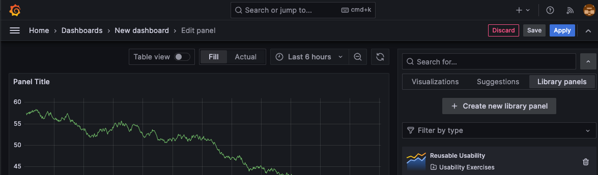 Add a Grafana library panel to a dashboard when you want to provide visualizations to other dashboard users.